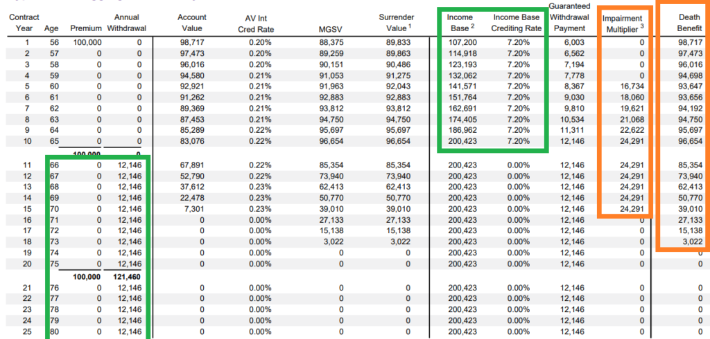 66세부터 받을 연금 금액 계산에 사용할 금액이다. 매년 고정이자 7.2%로 불어나 10년 후에 $200,423이 된다. 이 금액은 계약할 때 확정된 것이다.