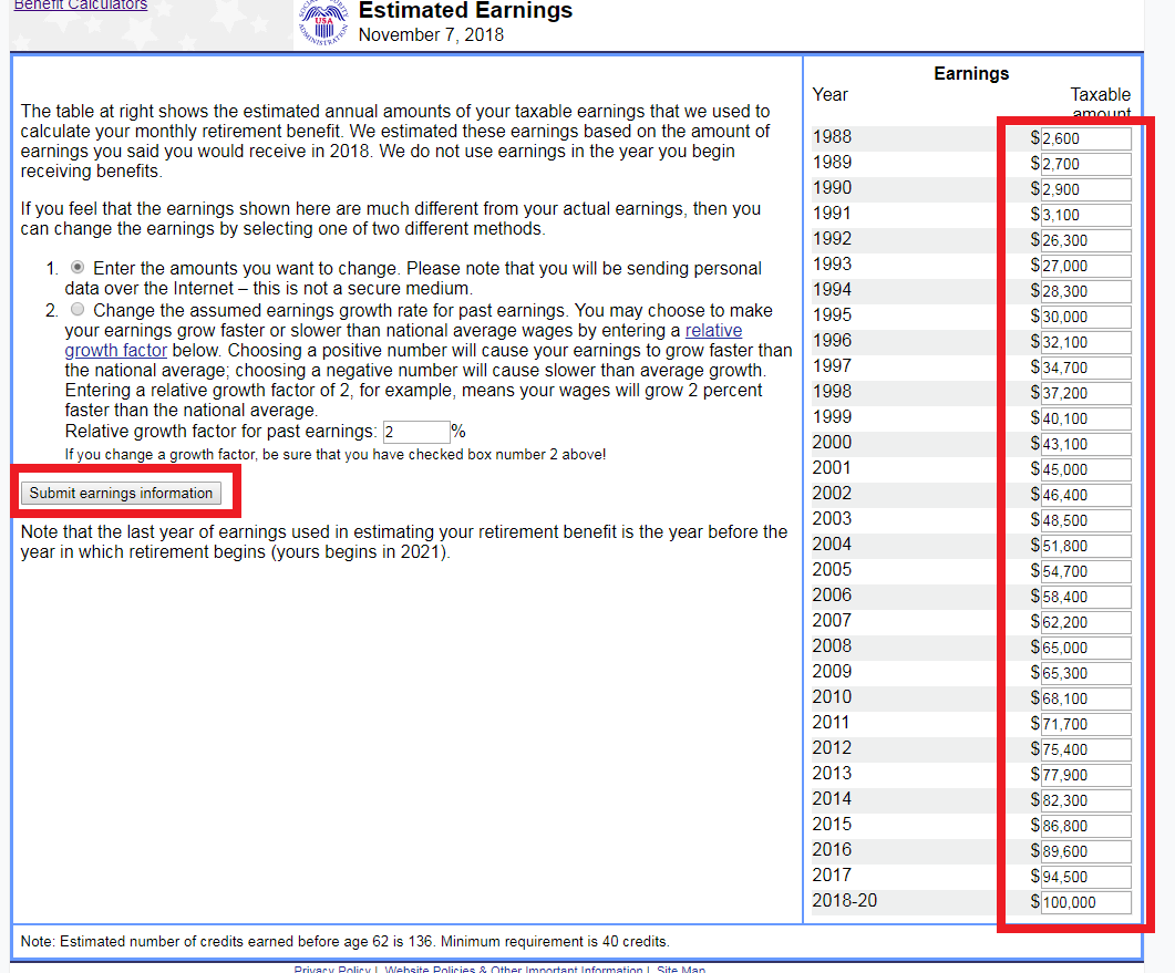2021년에 50세로 은퇴를 한다 해도 소셜 연금은 62세가 되는 2032년부터 $1,641을 받을 수 있다고 나온다. 하지만 이 예상 소셜 연금은 과거 소득을 계산기가 임의로 가정하에 계산한 것이다.