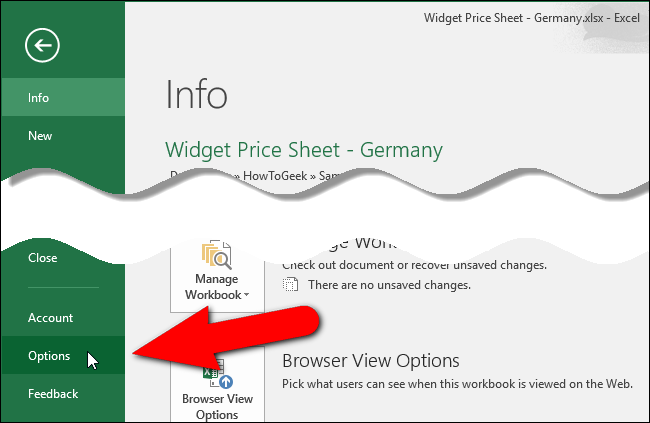백 스테이지 화면의 왼쪽에있는 항목 목록에서“옵션”을 클릭하십시오.
