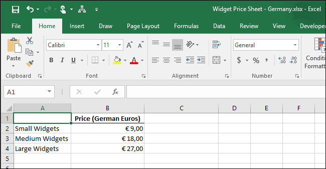 국가별로 다른 가격표를 만들고 있다고 가정 해 보겠습니다. 각 국가의 가격을 올바르게 표시하려면 가격에 소수점을 사용하고 수천 그룹을 구분하는 데 사용되는 문자를 지정하면 각 숫자를 필요한 경우 수식에 사용할 통화 번호 형식으로 유지할 수 있습니다. Excel에서 소수점과 천 단위 구분 기호를 변경하는 방법을 보여줍니다.