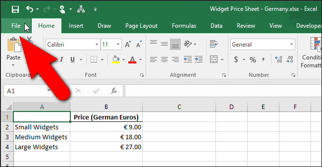 Excel에서 사용되는 소수점 및 천 단위 구분 기호의 유형을 변경하려면 “파일”탭을 클릭하십시오.