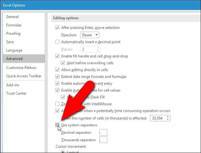편집 옵션 섹션에서“시스템 구분 기호 사용”확인란을 클릭하면 상자에 확인 표시가 없습니다.