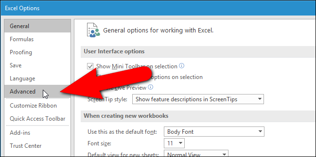 Excel 옵션 대화 상자가 표시됩니다. 왼쪽의 항목 목록에서 “고급”을 클릭하십시오.
