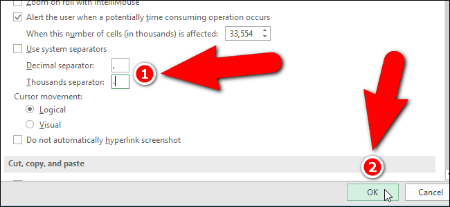 “소수 구분 기호”및 “수천 구분 기호”편집 상자를 사용할 수 있습니다. 편집 상자에 각각 사용할 문자를 입력하고 “확인”을 클릭하십시오. 이 예에서는 쉼표를 소수 구분 기호로 사용하고 마침표를 천 단위 구분 기호로 사용합니다.