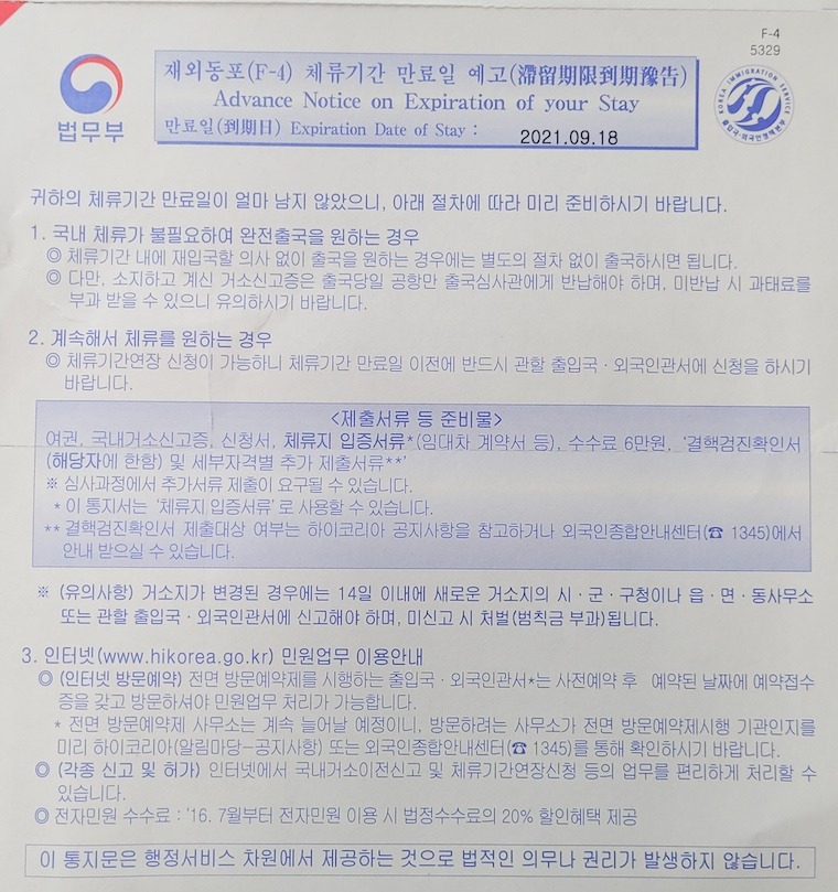 F4 비자와 거소증을 가지고 있다면 만기 약 3개월 전에 법무부에서 체류기간 연장신청서를 보내준다. (아래 참조). 체류 연장신청서에는 본인의 이름과 거소지가 기록이 되어 있고 이 통지서를 "체류 입증" 서류로 이용할수 있다. 거소증 연장은 만료되기 전에 신청을 해야 하며 다음과 같은 신청 서류가 필요하다. 출입국 관리 사무소는 예약제를 실시 함으로 만기 2달전 미리 예약을 하고 방문하는것을 권장한다 (예약만 하는데 1달 걸리수 있다).
