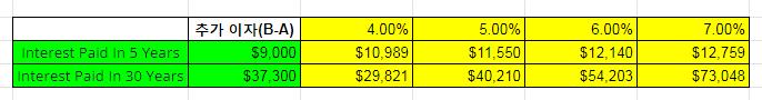총 지불한 이자 금액으로 계산해 볼 수 있다. 렌더 크래딧을 받았을 때가 5년 동안 $9,000의 추가 이자를 지불했다. 따라서, 손익 분기점은 5년이다.