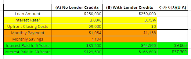 아래 사례는 클로징 비용 $9,000을 렌더 크래딧을 받지 않고 바로워가 직접 부담한 경우와 렌더 크래딧으로 렌더가 클로징 비용을 부담한 경우를 비교한 것이다. 렌더 크래딧을 받지 않으면 3% 이자율이고, 렌더 크래딧을 받으면 이자율이 0.75% 높은 3.75%다.